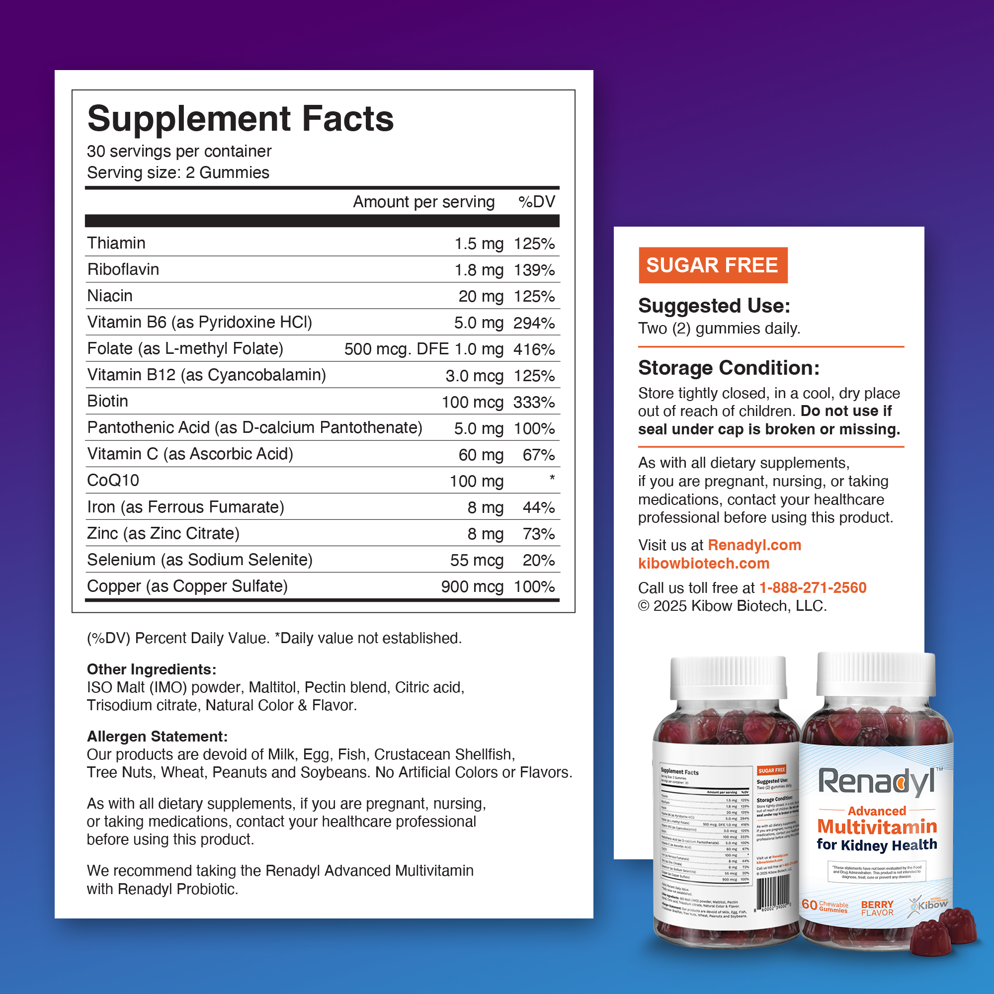 Renadyl Advanced Multivitamin for Kidney Health is made in the USA by Kibow Biotech, the leader in kidney research for over two decades. Kibow Biotech is committed to offering the highest quality and affordable non-drug dietary vitamins and supplements, making good kidney health accessible to everyone.